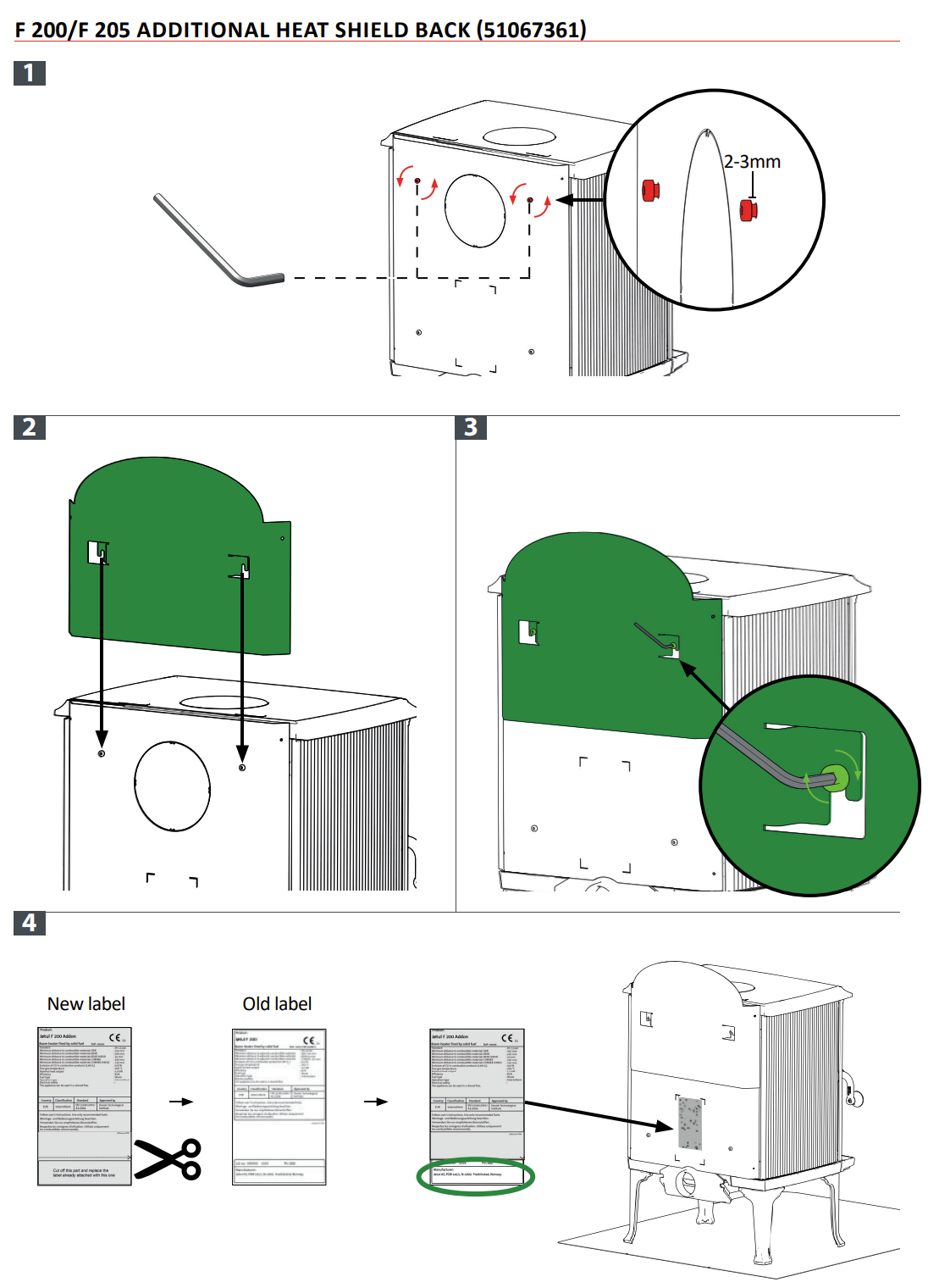 Er is geen gevaar of brandrisico verbonden aan deze situatie, maar als de kachel dichter dan 200 mm van een brandbare achterwand of dichter dan 200 mm (F 200) / 225 mm (F 205) van een hoek is geplaatst, moet de wand worden beschermd met een extra hitteschild.